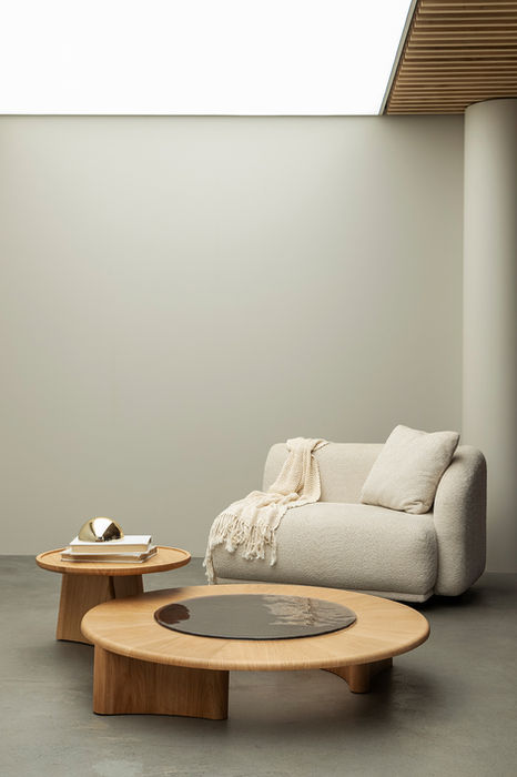 Idealizando os locais de onde se contemplam horizontes, os mirantes, propomos um design que harmoniza a solidez das bases côncavas, com os tampos planos que simbolizam a amplidão dos espaços abertos. As mesas de centro e laterais apresentam tampos redondos e bases formadas por sólidos com superfícies laterais convexas. Na mesa de centro, o vidro fusion faz uma menção à transparência das águas e o detalhe oblíquo da base traz leveza e dinamismo ao seu design.