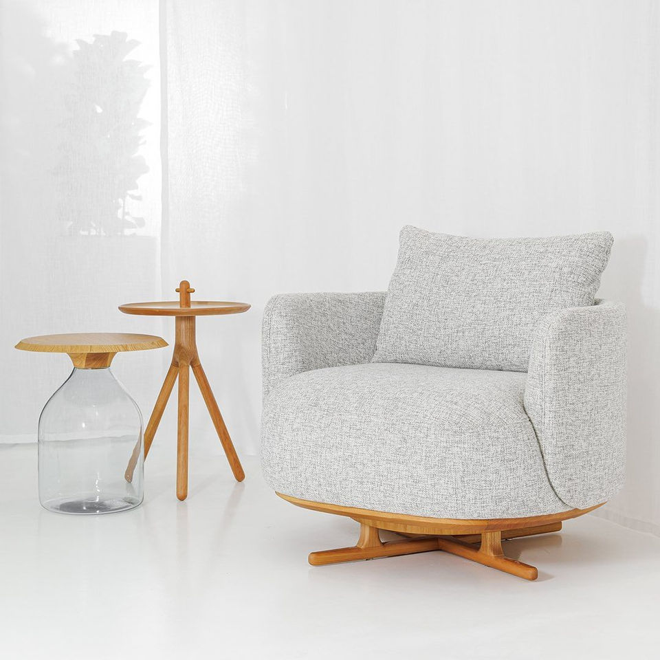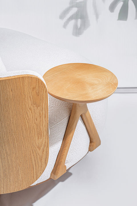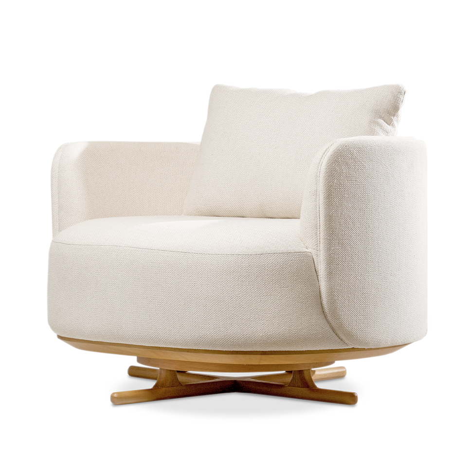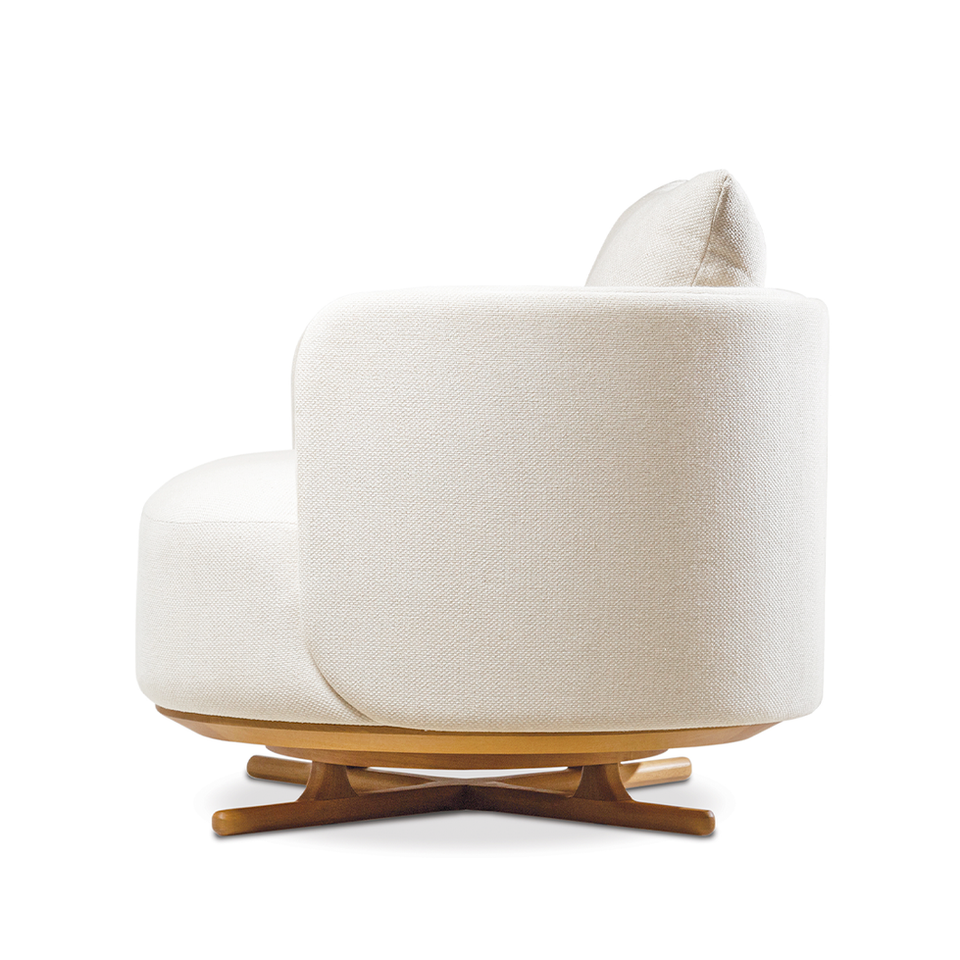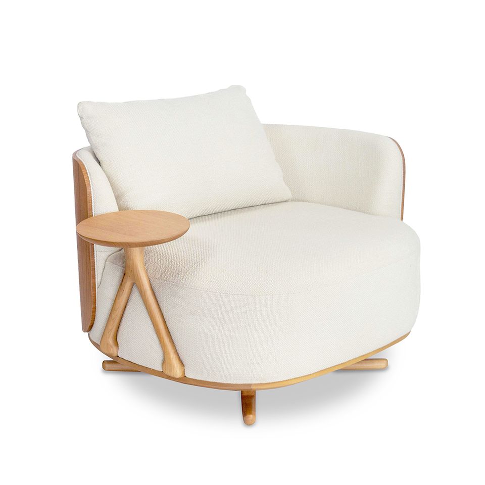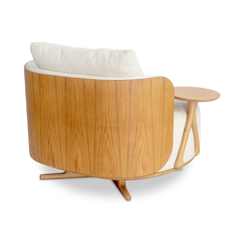 As formas arredondadas de assento e encosto nos convidam a relaxar e a compartilhar uma gostosa conversa. A base em madeira, com suas formas orgânicas, representa as raízes e a conexão com o ambiente. A almofada solta do encosto nos sugere descontração e muito conforto.