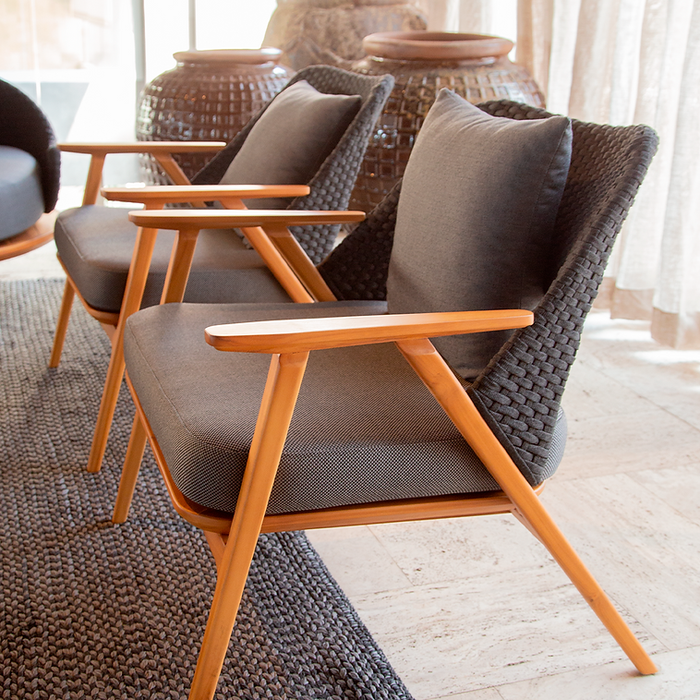 A poltrona mescla a sofisticação e o aconchego da madeira com a modernidade do tricô náutico. Traz aconchego na curvatura do encosto e nas texturas dos materiais.