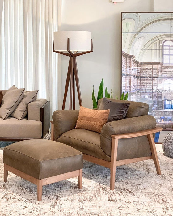 Encosto e braços são envolvidos pela estrutura aparente em madeira, com perfis delicados e cantos arredondados, trazendo elegância e personalidade à peça. A almofada solta combinada ao assento fixo com percintas elásticas proporcionam excepcional conforto.