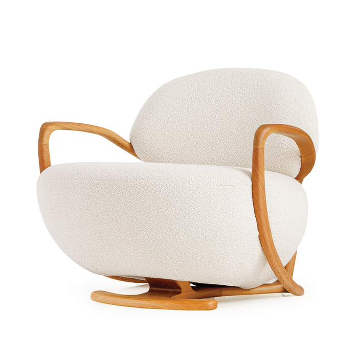 Esta peça surpreende pela fluidez dos braços em madeira, totalmente curvilíneos, que envolvem a estofaria nas costas e na base, criando um exoesqueleto de linhas orgânicas que recebem dentro de si os volumes arredondados de assento e encosto. Extremamente confortável, Zaha nos apresenta um design capaz de conciliar ousadia e elegância, com as melhores qualidades da marcenaria de alto padrão.