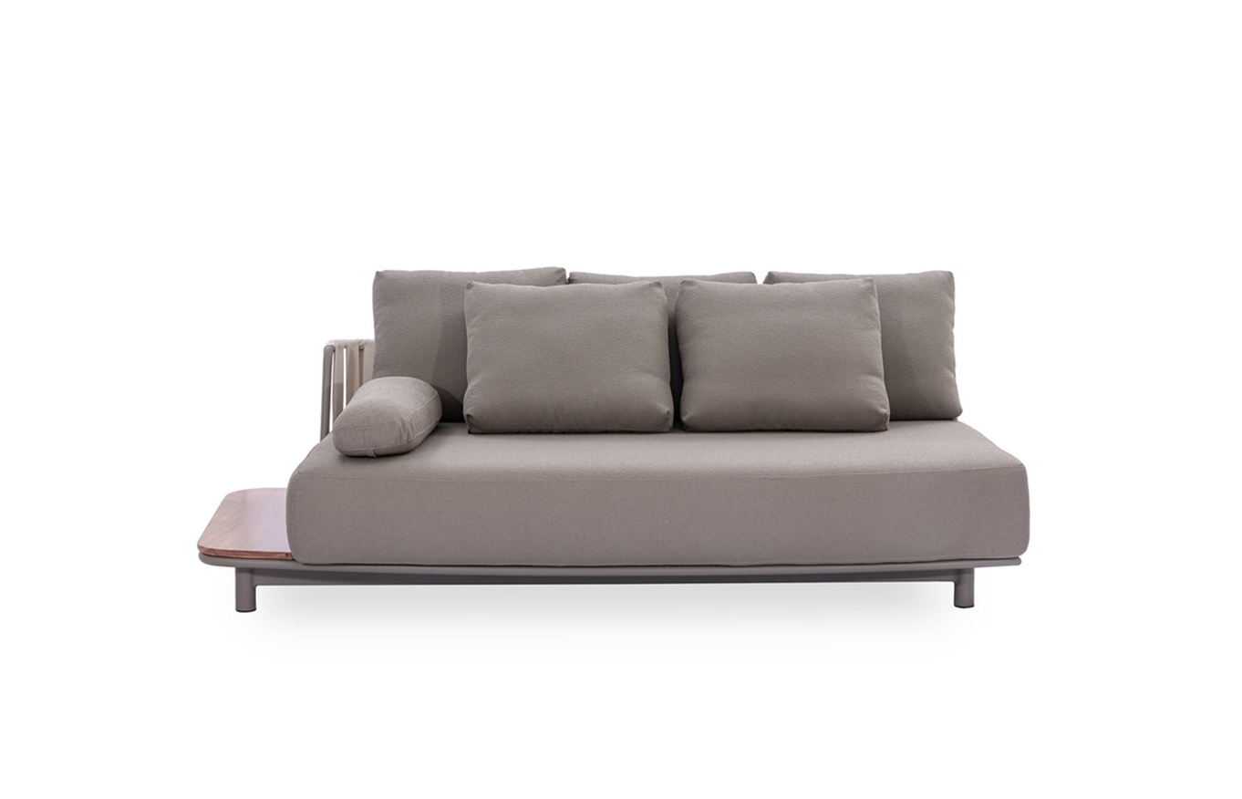 O sofá Coral é uma presença leve e elegante em ambientes outdoor. Tem como destaque a harmonia de cores e combinação de materiais, com base em alumínio tubular que suspende o tablado em madeira ripada que por sua vez apoia o assento estofado e o encosto com trama em fita náutica.